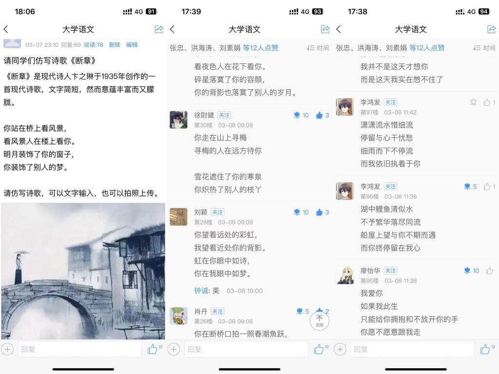 近日,学院的大学语文“课程思政”示范课程进行了一次有益的尝试。在教师的引领下,学生们仿写了著名现代诗人卞之琳的诗作《断章》,并将作品上传到学习通平台,展现了出色的创作才华。
