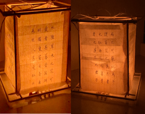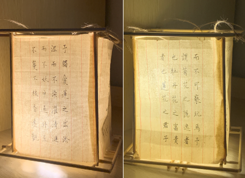 作品简介:作品《笼昼》中的灯笼框架由一次性筷子组成、香薰蜡烛照亮灯笼,四面灯笼壁上写上了周敦颐的《爱莲说》一文,学习时文字与香薰的光相互交映,营造出一种古雅的氛围感,文字与手工装饰的结合,既传达了艺术的美,也表达了对勤廉教育的倡议。
