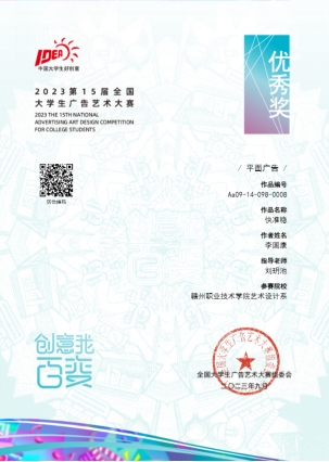 近日,第15届全国大学生广告艺术大赛落下帷幕,由艺术设计系刘玥池老师指导的学生李国康作品《快准稳》获得全国总评审(决赛)优秀奖,韩思语老师指导的学生钟欣桐、谢顺鑫作品《泡泡玛特x国粹机甲系列》获得江西赛区三等奖,总体成绩是我院参加该赛事以来的最好记录。