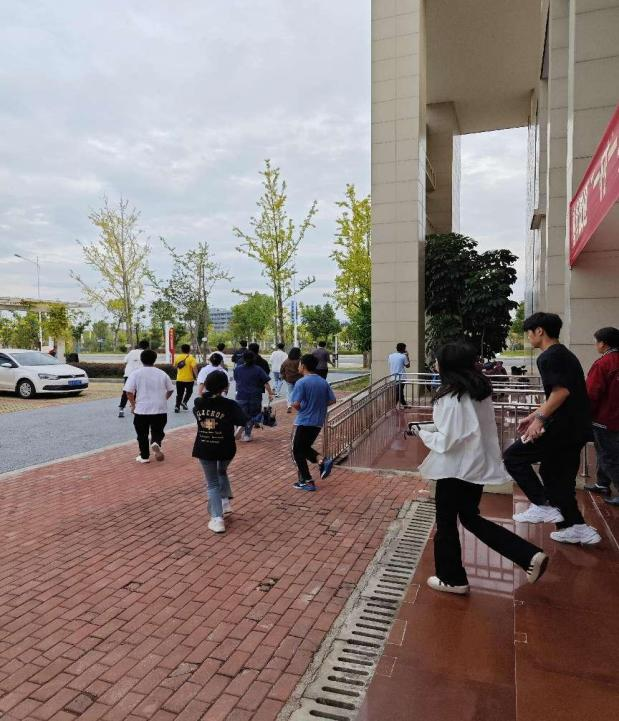 讲座结束后,开展应急疏散演练活动。会场模拟火灾事故发生,警报一响,全体人员按照会前规定的疏散路线有序迅速撤离至学校正大门广场处。