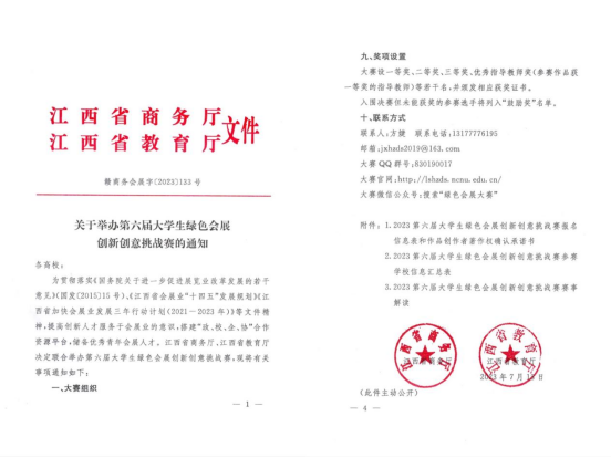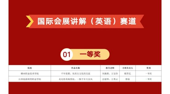 近日,学院公共基础部党员教师刘漫莉、王宝珍指导,学生熊哲亿、万木婷、郭开、何容的参赛作品《千年瓷都 东西方文化的交流》在2023年第六届全国大学生绿色会展创新创意挑战赛上通过初赛、决赛与来自全国50多支队伍的激烈角逐,荣获国际会展讲解(英语)赛道高职组一等奖第一名。艺术设计系教师潘小慧、冯雪华指导,学生谢宝发、龚晟、袁维、朱星生、汪筠玥的参赛作品《“瓷”续发展 贸连全球》获高职高专组会展设计赛道二等奖;艺术设计系教师严威、韩思语指导,学生温丽婷、温燕帆、甘荣华、张小玲、覃小丽的参赛作品《畅通产业链 绿色促消费》获高职高专组会展设计赛道三等奖;信息工程系教师刘康兴、曾小斌指导,学生陈佳宜、宋青青、马冰妍、欧阳苏苏、刘懿(农林工程系)的参赛作品《2023江西稀土产业新材料及应用博览会项目策划方案》获高职高专组会展项目创意赛道三等奖。