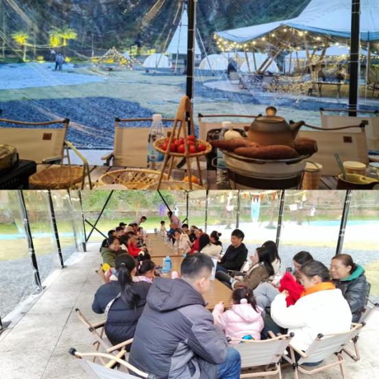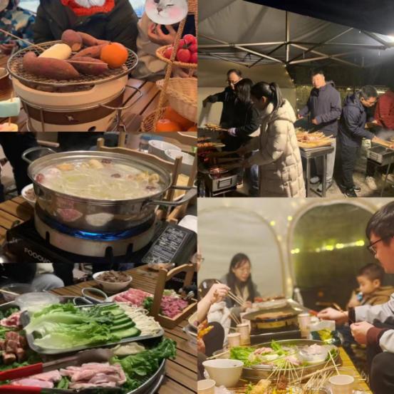 最后,到了最令人期待的晚餐环节。此次活动为自助晚餐,营地为工会小组提供了烧烤、火锅、烤盘烤肉、意面披萨、面条饺子、饮品等项目。露天围炉煮茶结束后,教师们分为四个小组进入了帐篷,享用烤盘烤肉、火锅、意面披萨、面条饺子等美食。烧烤区在营地开放处,工会小组的烧烤能手在晚餐时间轮流在烧烤区,为教师们提供烤肉服务。晚餐在帐篷与星光的美好场景,美食与欢笑的美妙烘托下落下帷幕。