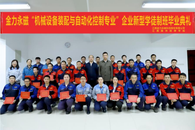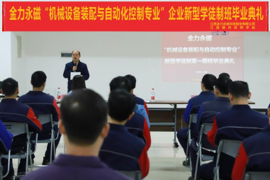 11月30日,智能制造系金力永磁“机械设备装配与自动控制专业”新型学徒制班毕业典礼在金力永磁会议室举行。此次毕业典礼标志着新型学徒制班学员们圆满完成学业,即将踏上新的职业征程。
