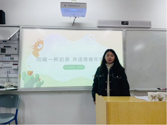 12月18日,现代服务系在以升楼104南教室举办了一场关于青春的茶话会,由现代服务系专职辅导员余艳辉和同学们共话青春,为处在疑惑期的同学们排忧解难,用一杯奶茶打开青春的话匣,从学生的学习与生活再到青年的责任与担当。