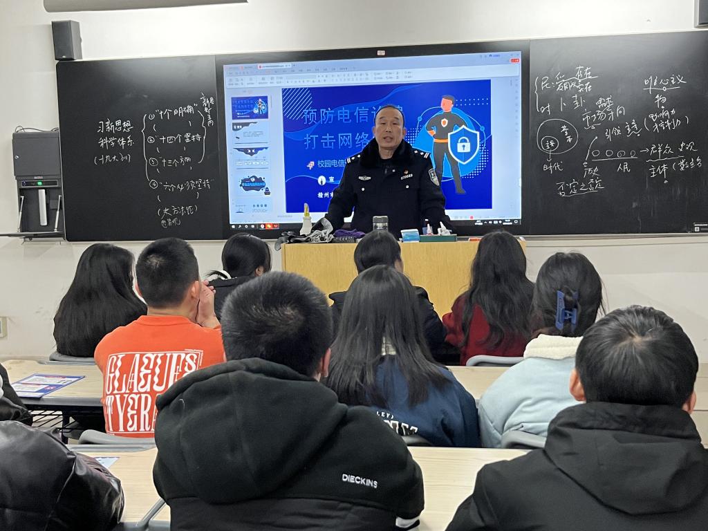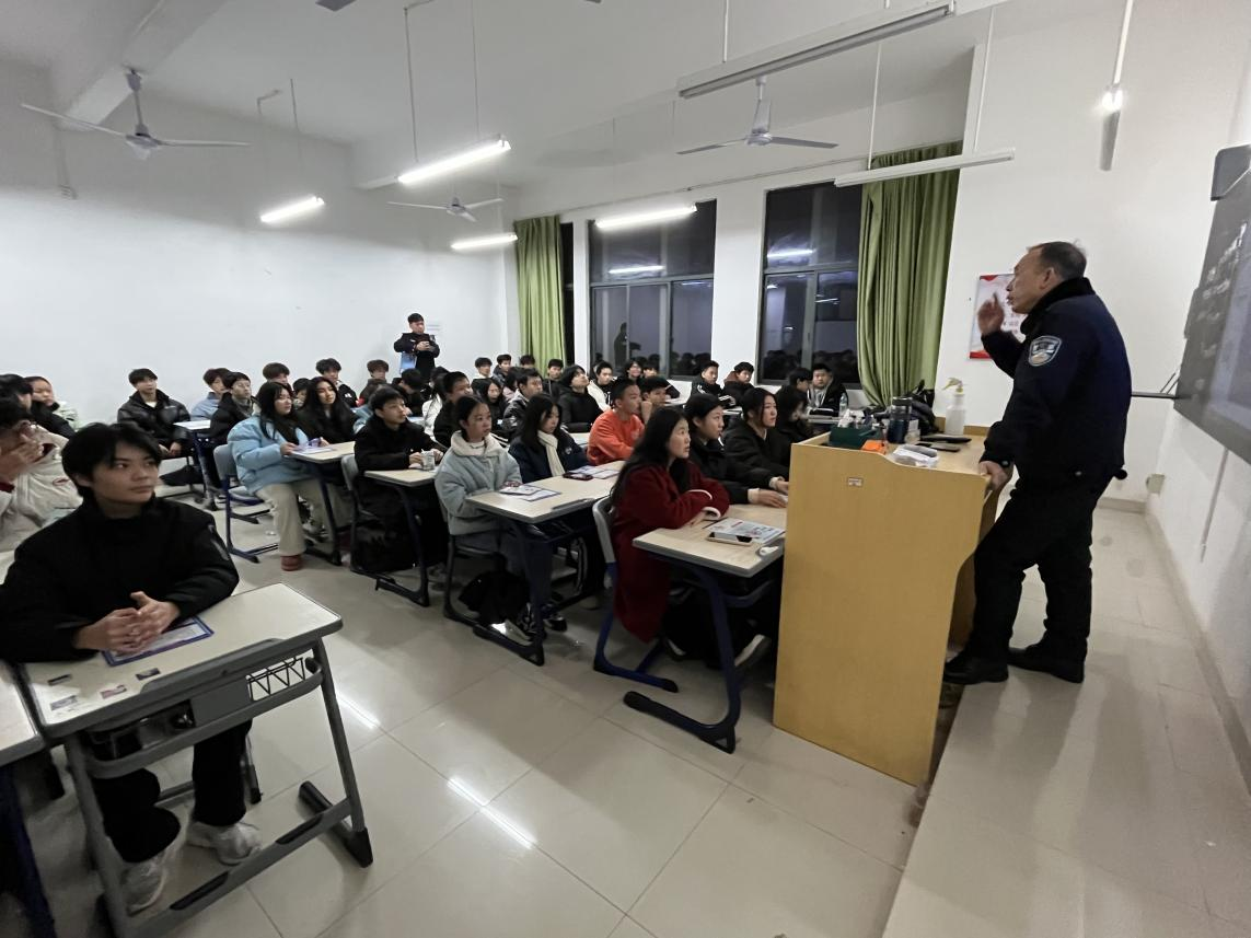 近日,为提高广大师生对诈骗犯罪的防范意识,新能源汽车科技城派出所特别组织了一场民警进校反诈宣传活动。活动在天佑楼224举办,由派出所郭荣峰副所长主讲,宣讲会得到了校方和师生的大力支持和积极响应。