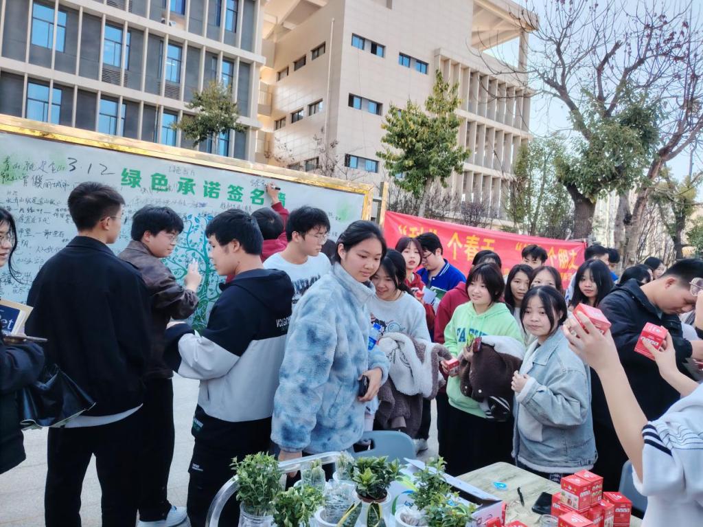 整个活动现场气氛热烈,陆羽楼下排起了长队。有的同学小心翼翼捧着刚种的盆栽,眼神专注而充满期待;有的热烈交流着养护心得。来自现代服务学院的谢同学感叹说:“这次活动让我真正体会到绿色生活的意义,我会从自己做起,把领养的小植物养好,为环保尽一份力。”
