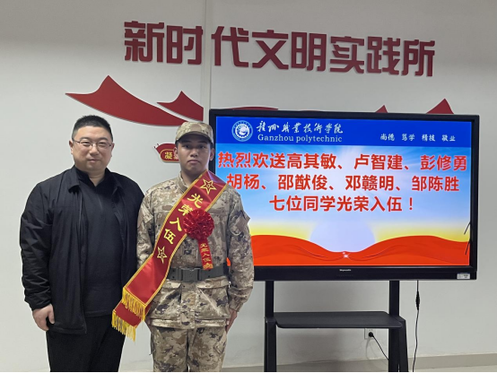 本次经济管理学院共有七名学生光荣入伍,他们分别是2021大数据与会计三年制1班高其敏、卢智建、彭修勇,2021电子商务三年制1班邹陈胜、2021电子商务三年制2班邓赣明 、2021电子商务三年制3班邵猷俊、2021跨境电子商务三年制班胡杨。