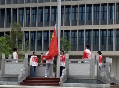 护旗手们迈着整齐的步伐,护送着鲜红的五星红旗走向旗杆,随着国歌响起,全体师生面向国旗,肃立行注目礼,高唱国歌,五星红旗缓缓升起,迎风飘扬。