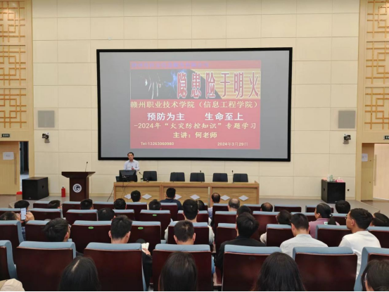为提高消防安全意识,普及消防安全知识,增强火灾预防与应对能力,确保校园消防安全筑牢坚实基础,3月29日下午,信息工程学院在图书馆报告厅举办了以“预防为主,生命至上”为主题的火灾防控知识专题学习讲座。本次讲座邀请了赣州市社安应急公司何家好老师为主讲人,信息工程学院全体教师参加此次专题学习活动。