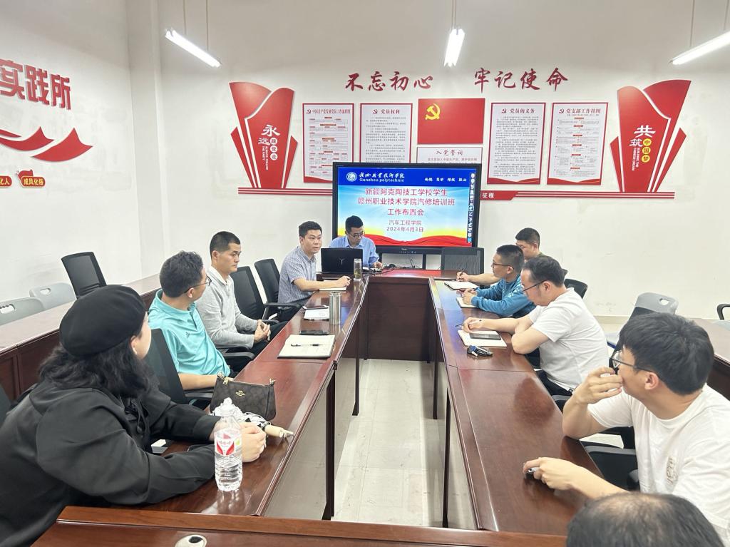 汽车工程学院副院长明建平就培训内容、要求做了详细说明,根据阿克陶县中等职业技术学校培训班学生的专业知识和职业技能情况,开设汽车维护与检验、汽车美容与装饰、汽车钣金技术、汽车喷漆技术、新能源汽车技术、汽车修理工国家职业资格证书(初级)考证等6个培训项目,及德育《大国工匠》、美育《客家传统文化》、体育、劳动教育等课程,并将开展企业专业实践、客家传统文化研学、红色文化研学、体育赛事等实践活动,要求培训教师做好考勤、考核等相关工作。