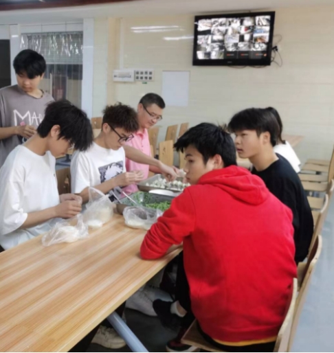 接着,大家分成四个小组分别围坐在一起,迫不及待地大显身手。加馅、折叠、捏合……一气呵成,每位同学都展示出自己独特的包饺子技巧。不少同学还是第一次包饺子,但认真学习一丝不苟包饺子的状态让人称赞。大家逐渐掌握了包饺子技能,包出的饺子还不错,“功底好”的同学还尝试包花式饺子,孩子们创意与技艺齐飞,包出的饺子有的像小笼包,有的像喇叭,有的像元宝,大家忙得不亦乐乎。教师们也参与其中,师生们有说有笑,现场气氛热闹非凡,一盆盆馅料和一片片欢声笑语一起被包进了面皮中,被牢牢捏紧的不仅是饺子皮,还有深厚的师生情谊。