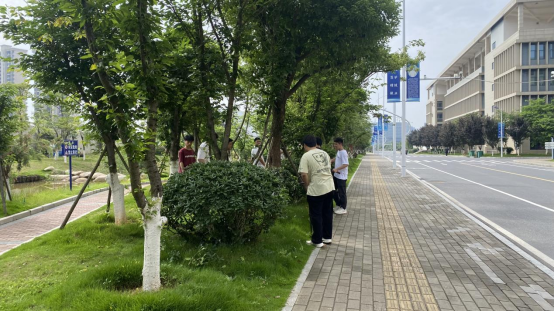 现场分组实践,学生们手持园艺工具,在导师的指导下对校园内的行道树、灌木丛等进行合理修剪,学习控制枝干生长方向、疏剪徒长枝条等技艺,将所学理论知识转化为实际技能。大家在为校园植被“理发”的同时,也体会到了党建品牌“以花育人”的深刻内涵,培养了劳动精神和环保意识,感受到了“绿水青山就是金山银山”的真谛。