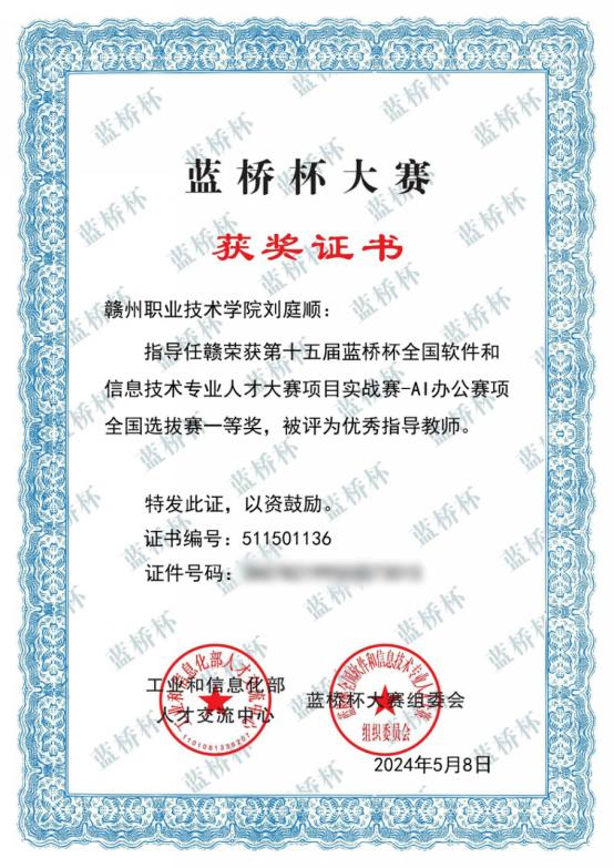 近日,蓝桥杯全国软件和信息技术专业人才大赛传来捷报,信息工程学院大数据2312班学子任赣在全国选拔赛中荣获一等奖,并在之后的全国总决赛中荣获赛项三等奖,指导教师刘庭顺荣获“优秀指导教师”称号。