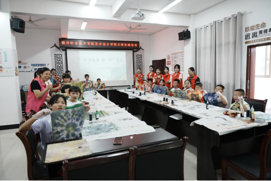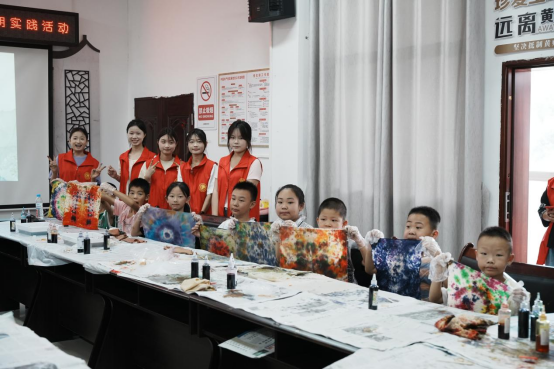 色彩与图案中的文化记忆。作为艺术设计学院的学生,“染心扬帆”队还充分发挥专业优势,为留守儿童带来了扎染教学课程。他们耐心地向孩子们介绍扎染的历史渊源、艺术特色及制作流程,并手把手地教他们如何扎结、染色、拆结等技巧。在孩子们的巧手下,一块块普通的布料逐渐变成了色彩斑斓、图案独特的扎染作品。