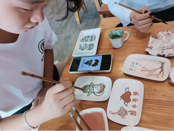 拉坯环节结束后,来到瓷上釉阶段,大家充分发挥创意,将现代元素与传统吉州窑相结合,赋予作品新的生命力。志愿者们或低头沉思,或轻轻地在陶器上勾勒线条。草图逐渐成形,有的简约而富有意境,有的复杂而精致入微,每一笔都承载着创作者的情感与故事。