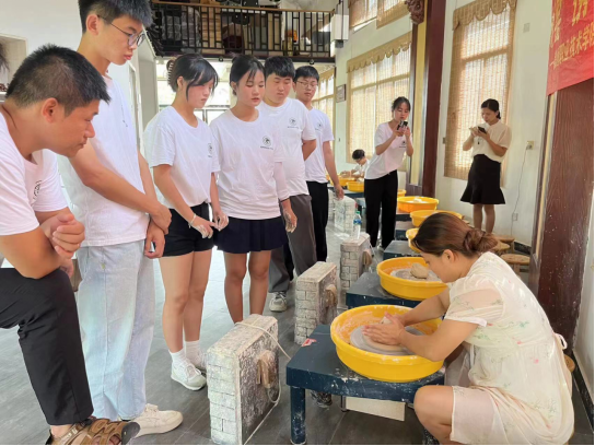 志愿者们先参观了陶瓷研究所,了解到了关于吉州窑的历史和陶瓷制作工艺,随后志愿者们跟随陶艺师傅开始体验陶瓷制作。