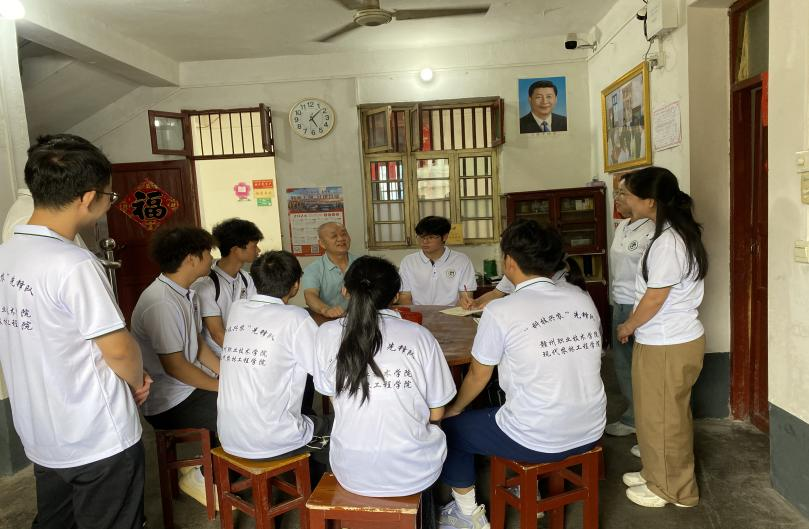 7月31日上午,实践队来到于都县潭头村孙观发老人家中。大家围坐一起,听孙观发先生讲述红军长征、抗美援越那段峥嵘岁月中的故事。在2019年,习近平总书记带着深情大爱来到这里视察,察看老区人民生活情况。如今的梓山镇,脱贫攻坚取得全面胜利的伟大成就、万亩蔬菜大棚林立,蔚为壮观、富硒蔬菜远销粤港澳、搭上中欧班列出口国外,蔬菜、旅游产业的发展成为当地群众增收致富的“新引擎”,让当地的群众生活“芝麻开花节节高”。