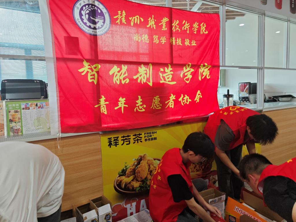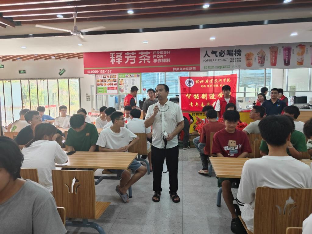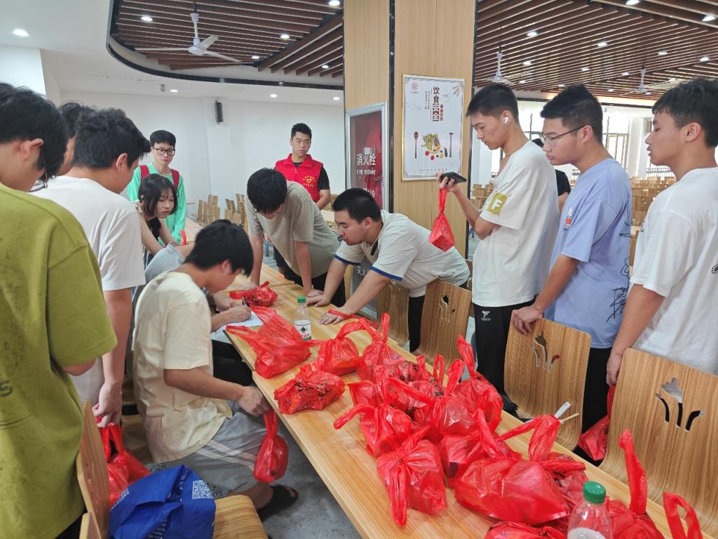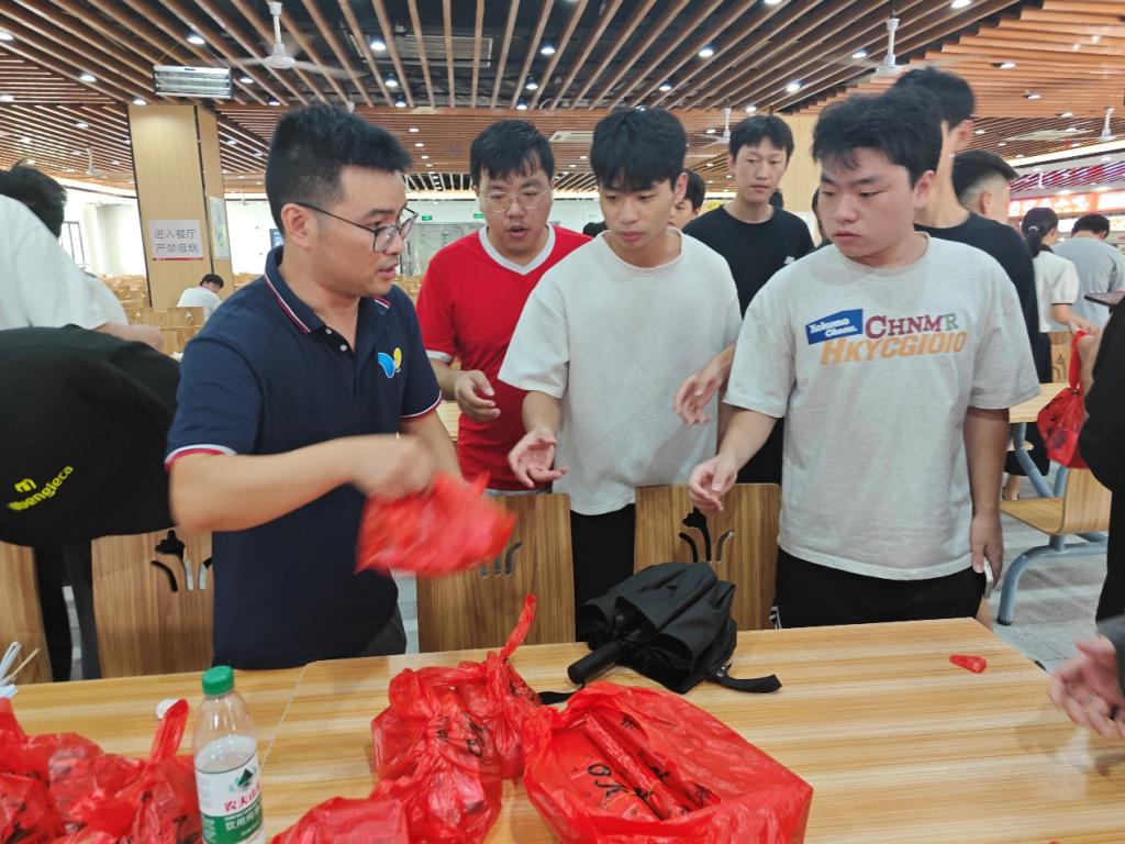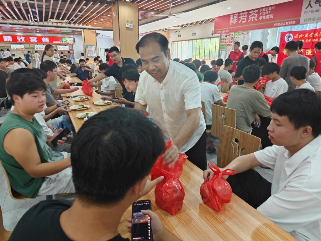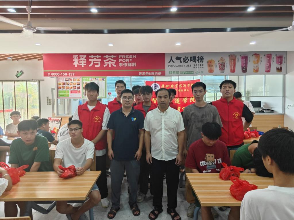 9月16日中午,智能制造学院副院长冯发勇和教师黄保富、阳先波带领智能制造学院青年志愿者协会来到二食堂一楼,现场一起向同学们致以诚挚的问候和暖心的祝福。将一份份饱含深情的礼物送到同学们手中,这一过程不仅体现了学院细致入微的关怀,更彰显了老师和同学们之间深厚的友谊。