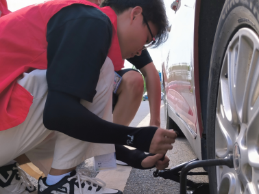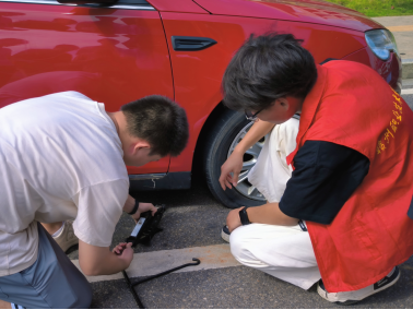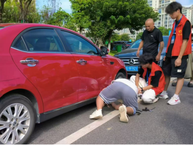 9月19日上午9点左右,一位家长的车辆因左前胎漏气停在路边,尝试用自带的维修工具修车,却因操作不熟练未能成功。当时经过的志愿者们发现这一情况后,迅速上前了解情况,提供帮助。