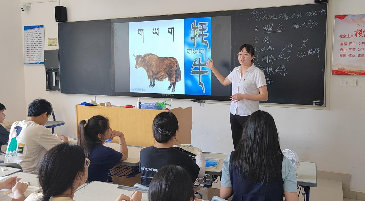 本次课程围绕“动物的接近和保定”展开。在讲解如何接近猪、马、羊等动物的技术后,聂老师提出了一个新的问题:如何接近牦牛。学生们积极讨论,分享个人见解,展现了对西藏牦牛文化的浓厚兴趣。之后,聂老师演示了接近牦牛时的藏语语言,指导同学们书写牦牛的藏文“གཡག”,同时讲解了牦牛在西藏地区的经济和文化价值,帮助学生们深入理解这一丰富的文化体系。作为中华民族传统文化的重要组成部分,藏族优秀传统文化中,牦牛文化深植于藏族的民间信仰、祭祀仪式、文化艺术和日常生活中,并塑造了藏人忠诚、坚韧、勇敢、吃苦耐劳的精神品格。