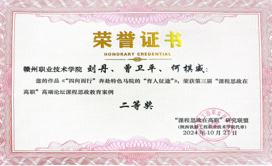 为深入学习贯彻习近平总书记关于学校思政课建设的重要指示精神和党的二十大及二十届三中全会精神和全国教育大会精神。近日,在陕西省渭南市举行的“课程思政在高职”研究联盟第三届“课程思政在高职”高端论坛上,来自全国各地的思政教育工作者齐聚一堂,共同探讨课程思政在高等职业教育中的创新与实践。经过评审,德赢官网提交的特色案例《“四向而行”奔赴特色马院的“育人征途”》脱颖而出,荣获本次论坛课程思政教育案例二等奖。德赢官网思政课教师代表刘丹作为获奖代表参会。