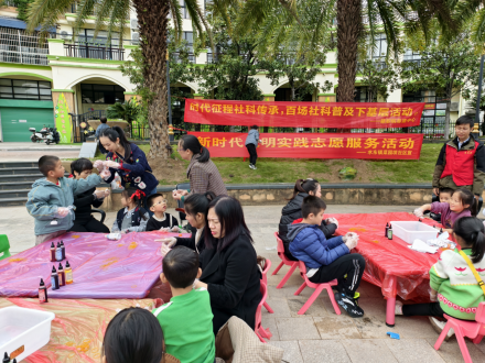 活动当天,社区活动区人头攒动,充满了欢声笑语。德赢Vwin官方区域合作伙伴非遗中心的老师们早早地来到现场,精心准备了扎染所需的各类材料,洁白的布料、五颜六色的染料以及各种绑扎工具一应俱全。