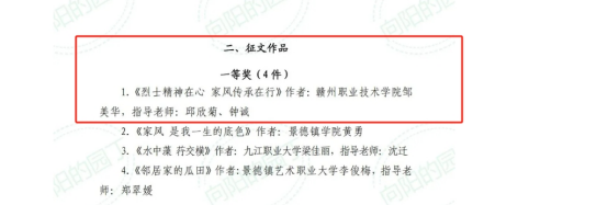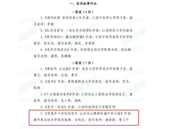 在本次大赛中,学校共有2件作品获奖,涵盖家风故事、征文等多个类别,充分展示了学校在家庭家教家风建设方面的丰硕成果。其中征文类作品《烈士精神在心家风传承在行》(作者:邹美华,指导老师:邱欣菊、钟诚)喜获一等奖,家风故事类作品《穿越半个世纪的坚守让井冈山精神传遍中华大地》(作者:刘福源、古纯杰,指导老师:谢春龄、曾卫平)喜获二等奖。
