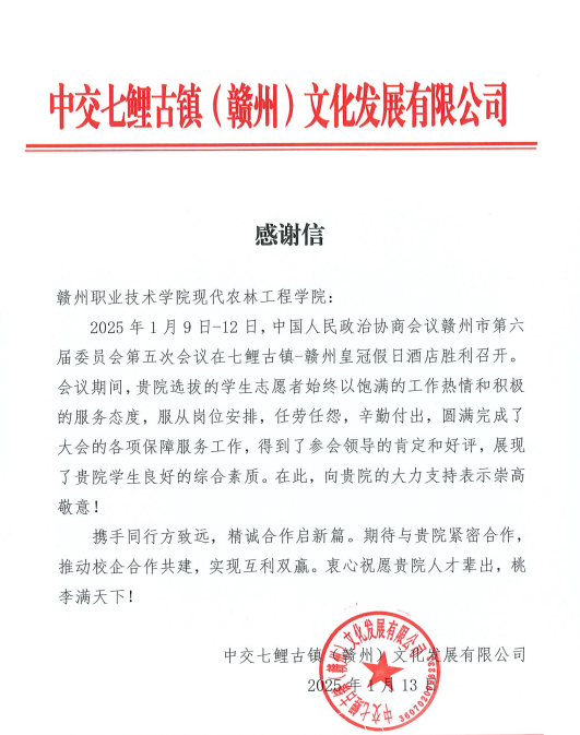 1月9日至12日,中国人民政治协商会议赣州市第六届委员会第五次会议在赣州皇冠假日酒店隆重举行。会议期间,现代农林工程学院选派出30名学生,组建志愿者团队,活跃在各个服务岗位。他们挥洒汗水、无私奉献,以实际行动书写青春华章,为会议的顺利进行保驾护航。