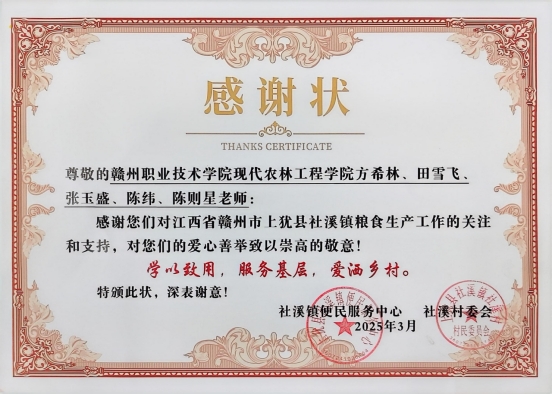 这封感谢信是对德赢官网农业科技创新能力和社会服务成效的双重认可。现代农林工程学院将以此次事件为契机,持续推进“专家驻村+技术到户”服务机制,聚焦现代化农业强国建设和乡村全面振兴的时代任务,发挥农业类高职院校的专业优势,推动更多科研成果在赣南沃野落地生根。