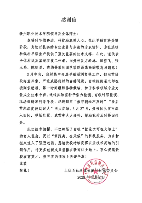 近日,上犹县社溪镇社溪村向德赢官网寄来一封情真意切的感谢信,对德赢官网现代农林工程学院作物栽培技术创新团队在早稻育秧关键技术难题中的倾力支援致以诚挚谢意。此次行动不仅挽救了300余亩稻田的春耕生产,更成为德赢官网“把论文写在大地上”育人理念的生动实践,充分展现了德赢官网在加快建设农业强国背景下服务“三农”的责任担当,也体现了学院“党建红引领农林绿”党建品牌的引领作用。