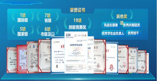 在竞赛舞台上,赖琨同样成绩斐然。凭借着扎实的专业技能和创新能力,在国内外高水平职业技能竞赛中屡创佳绩,累计获奖近20项,涵盖国际级、国家级、省级等多个层次,充分展现其技术实力与竞技水平。目前共荣获国际级荣誉1项,国家级荣誉5项,省级荣誉7项。在第三届江西省大学生职业规划大赛中,他凭借清晰的职业发展路径和行业洞察力,斩获成长赛道银奖第一名,充分彰显了优秀的职业素养与竞技实力。