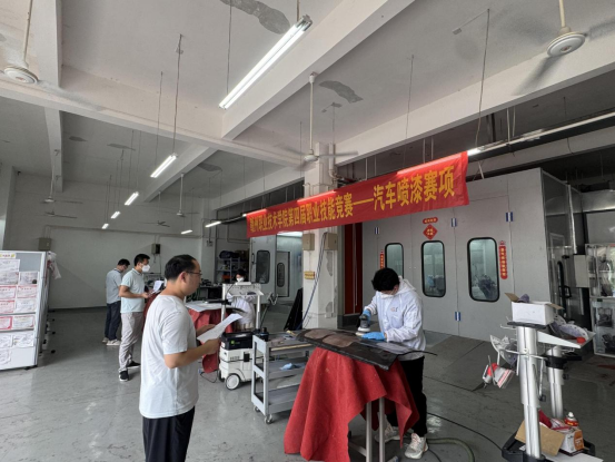 “汽车喷漆”赛项由叶景川、曾海源、胡俊杰老师牵头,比赛时选手们身着防护服,手持喷枪,全神贯注投入比赛。从底材处理到色漆喷涂,充分展现扎实技能。评委们严谨评审,从工艺水平、漆面效果等多维度打分。汽车喷漆竞赛为汽车维修专业学子搭建了实战练兵的舞台,通过以赛促教、以赛促学,激励学生勤加练习喷漆本领,为汽车行业输送技术过硬的喷漆工匠。