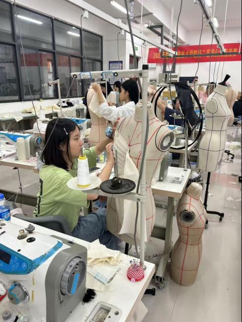 服装创意设计与工艺赛项,参照省级职业院校技能大赛标准,以“融古汇今”为题,设置服装创意设计、立体裁剪、成衣工艺制作三大模块,21服装五年制、服装23级学生全员参与,参赛队伍在8小时内完成从设计构思、绘制草图到成品制作的全流程比拼。