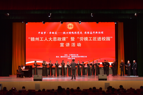 江西省五一劳动奖章获得者余丽霞讲述了工运领袖陈赞贤的革命事迹,带领师生重温工人阶级的奋斗历史。活动穿插的文艺表演将现场氛围推向高潮。赣州市职工合唱团带来的表演唱《劳动最光荣》、合唱《世界赠予我的》,以艺术形式传递劳动情怀。