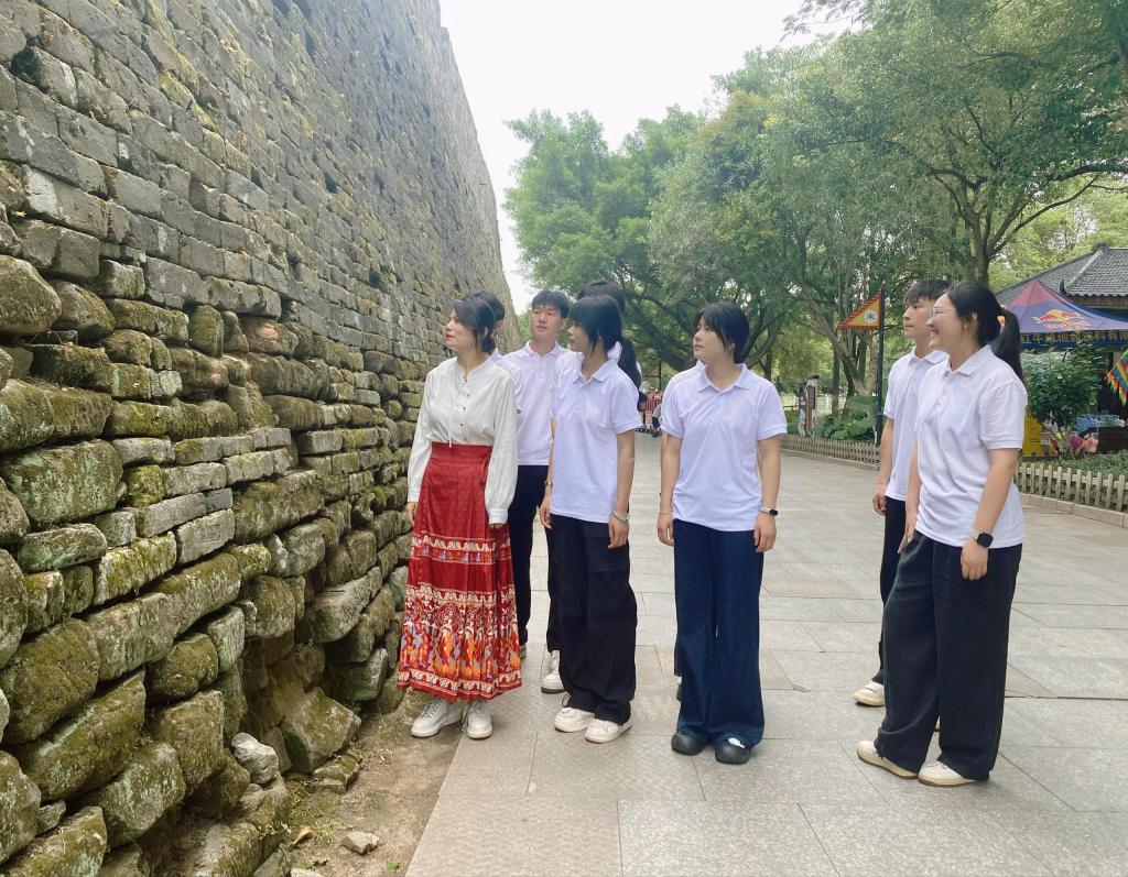活动首站抵达赣州古城墙,这座始建于北宋的军事防御工程历经千年风雨仍巍然屹立。学生们沿城墙徒步,观察铭文砖、炮城等遗迹,结合带队老师邬成霞对《虔州府志》的解读,深入了解了宋代筑城技术与赣州“铁城”美誉的由来。