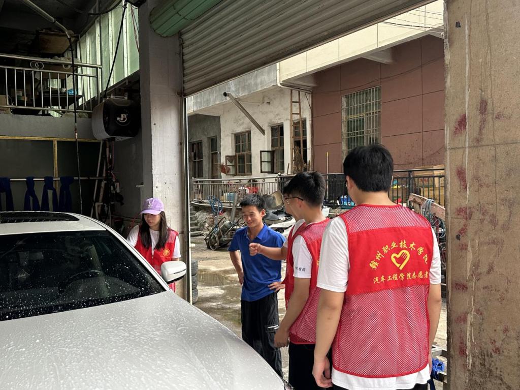 结合专业特色,实践队将“汽车养护课堂”搬到了乡村洗车店。在狭窄的巷道内,队员们熟练操作高压水枪、擦拭车身,为当地车辆提供免费清洗服务,赢得了村民的一致好评。此外,队员们还向洗车店员工学习了车辆保养技巧,交流了行业新动态,推动了专业技能与乡村需求的精准对接。这一活动不仅检验了学生的实操能力,也为乡亲们带去了实用技术,展现了职业教育服务社会的独特价值。