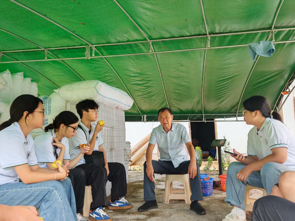 同时蒋大华也指出基地存在山区地形导致运输成本高,且黄桃成熟快、采摘不及易烂在地里等现实问题。面对这些问题队员们发挥园艺专业优势,建议可以利用课堂里学到的“产地简易预冷”的方法减少 10% 左右烂损降低运输成本,同时利用无人机或手机拍照,把果园按成熟先后分色块标记制作“成熟热力图”提高采摘效率,有效地将课堂所学理论用于助农实践。