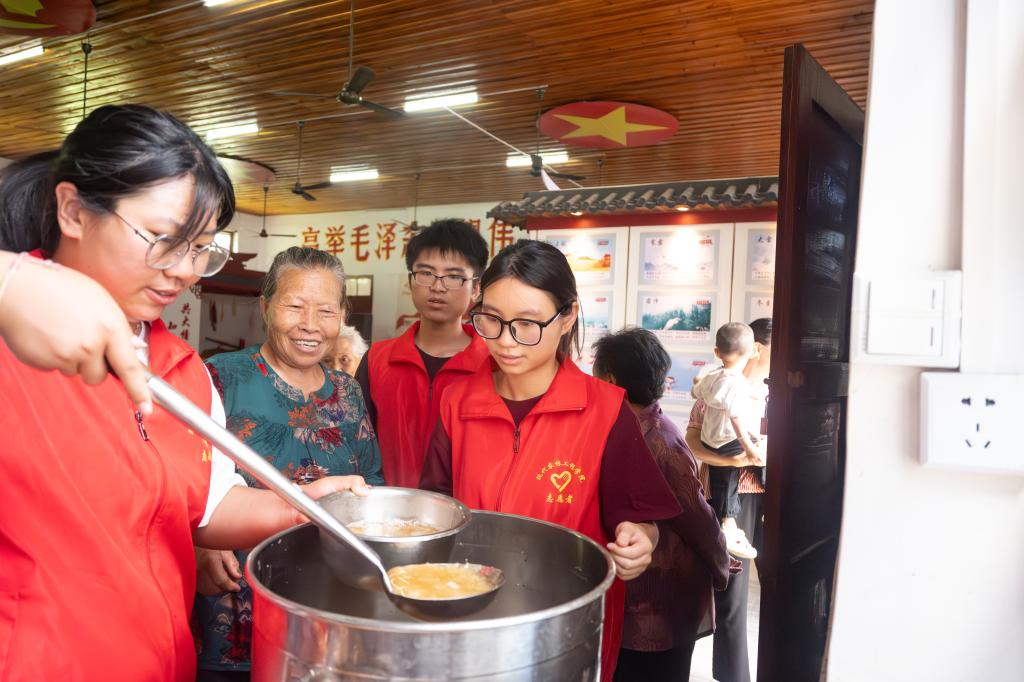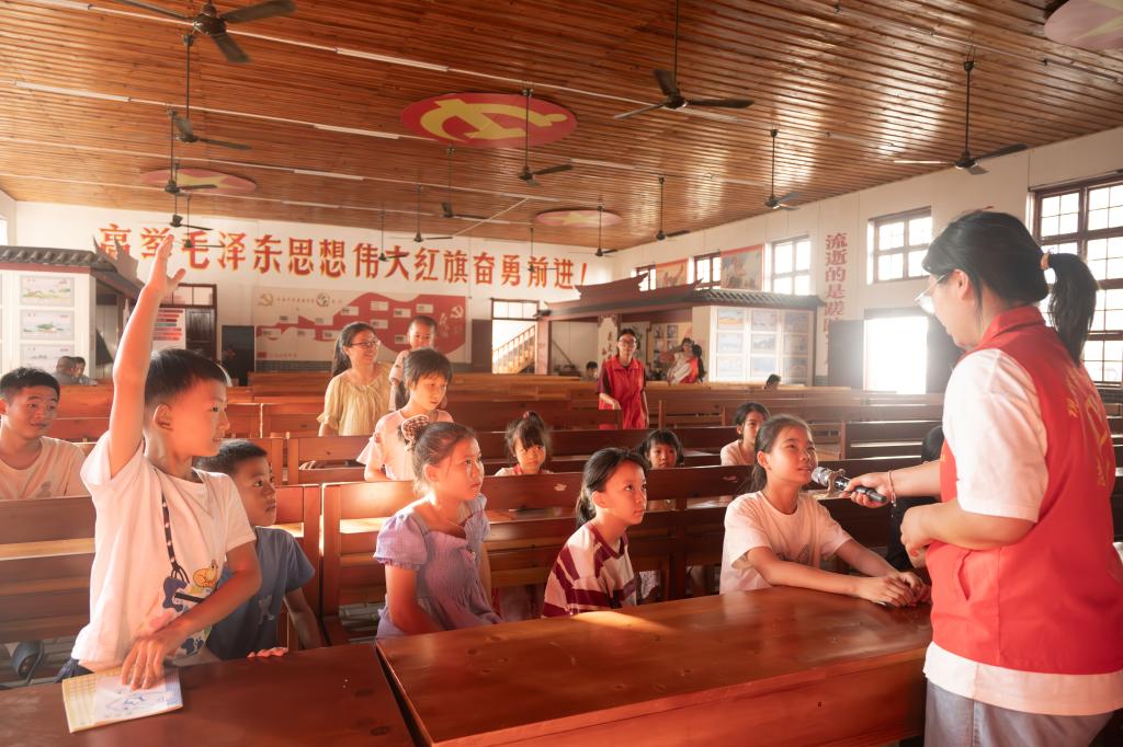 民生关怀同样细腻入微。队员们走访村民李奶奶家时,留意到部分家长因农事繁忙,难兼顾孩子陪伴与安全。于是,“童心港湾”在共大礼堂一角启幕,成为孩子的欢乐天地。考虑到乡村安全知识普及需求,队员们精心筹备安全讲座,从辨别变质食材、讲解农药残留危害,到普及防水放电要点,用通俗语言为孩子与村民筑牢安全防线。课后,一碗碗温热的莲子银耳羹送到老人手中,暖胃更暖心。在“童心港湾”,彩色粘土捏出鲜活荷塘,红色童谣唱出信仰力量,“你画我猜”“数字竞猜”等趣味游戏,让知识与欢乐并行,安全意识融入成长轨迹。