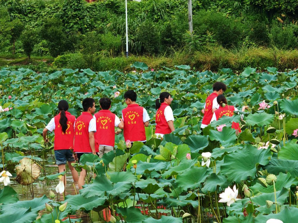 在百亩白莲田中,队员们挽起裤脚,赖书记边示范采莲技巧,边讲村里白莲产业发展的情况,从交流中队员们了解到“近五年白莲的产量与销量逐步提升,相比往年预计增产5%-10%,已经形成白莲产业链——上游:种植合作社提供种苗、技术。中游:加工以初级为主(脱壳、烘干),下游:通过批发市场、电商销售,文旅结合(如荷花节)逐步兴起”。从种植到销售规划,话语里满是对这片土地的热忱。队员们听着、干着,手上动作虽生涩,却把助农的决心,深深种进了这方孕育希望的莲田。