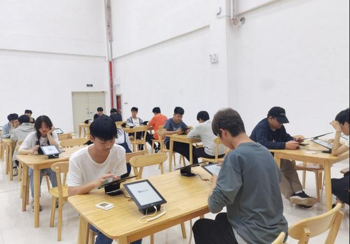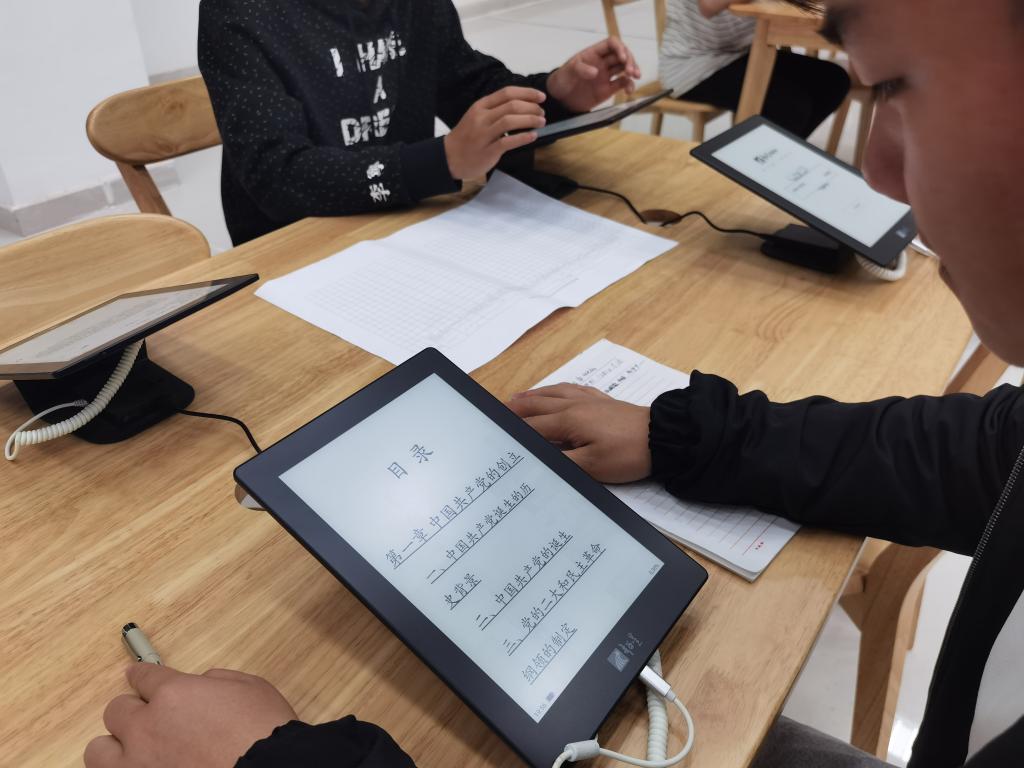 同学们通过电子平板阅读器,下载党史学习资料,在阅读平板上查阅党史资料。
