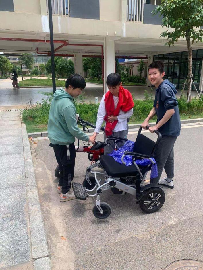 由于腿脚不便,对彭安邦同学而言,每天上下课,从寝室到教师的路是一段漫长的路。在夏老师的指导下,同学们会自发的伴彭安邦一同上下课,每天帮忙推着他的轮椅一起走,找他谈心时彭安邦感叹道:有学院的关心、有老师的教诲、有同学的帮助,未来的人生之路一定是充满阳光与幸福!