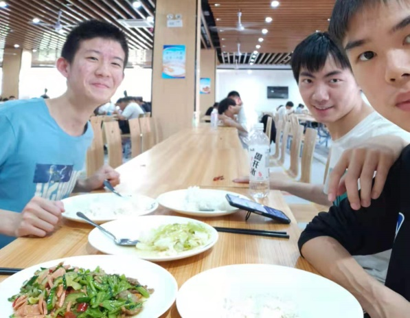 早餐有同学帮他带包子或者面包,午餐和晚餐安排班干部和学生与彭安邦同学一同吃饭,同学们主动帮他盛饭,大家的菜放在一起吃,其乐融融。