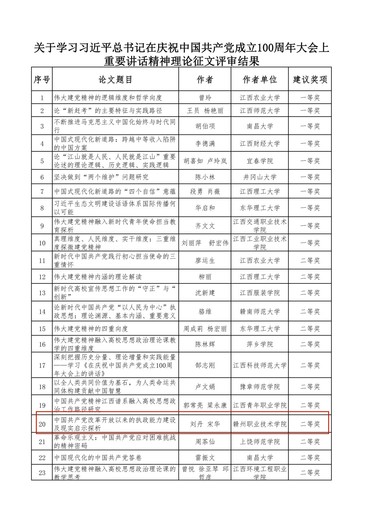 关于学习习近平总书记在庆祝中国共产党成立100周年大会上重要讲话精神理论征文评审结果的公示http://jyt.jiangxi.gov.cn/art/2021/11/18/art_25824_3741187.html