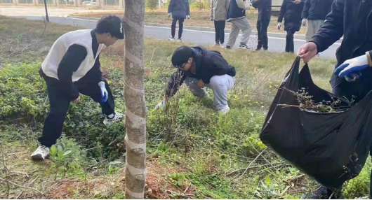在老师的带领下,信息工程系的同学们带着劳动工具来到系包干区。简单分工后,同学们积极开展打扫工作,捡垃圾、除草,暖阳下,劳动的身影在校园里不停穿梭。