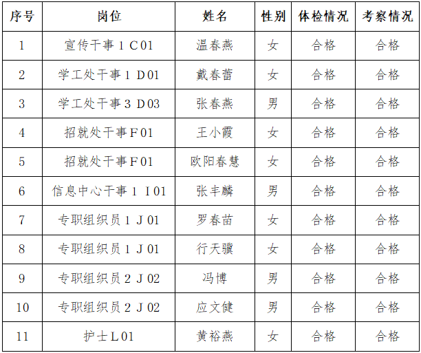 根据《德赢Vwin官方区域合作伙伴2021年面向社会公开招考工作人员公告》要求,经过报名、资格审查、笔试、面试、体检、考察等程序后,现将温春燕等11名拟聘用人员进行公示。