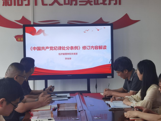 为推进党纪学习教育走深走实,6月14日中午,经济管理学院党支部书记李光华在阳明楼510会议室为经济管理学院党支部全体党员上了一堂《中国共产党纪律处分条例》修订内容解读的专题党课。