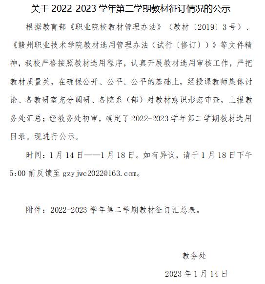 关于2022-2023学年第二学期教材征订情况的公示