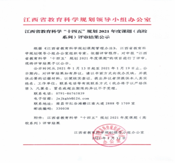 近日,从省教育厅文件《江西省教育科学“十四五”规划2021年度课题(高校系列)评审结果公示》获悉,学院思政课教师郑芝君主持的课题《“新自由主义”对高校“90后”青年教师育人观的影响及对策研究》获省教育科学“十四五”规划2021年度青年专项课题。