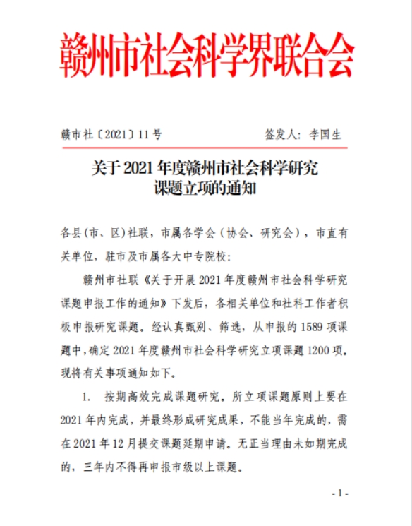 近日,从赣州市社会科学界联合会发布的《关于2021年度赣州市社会科学研究课题立项的通知》(赣市社〔2021〕11号)获悉,我院11项课题喜获立项。