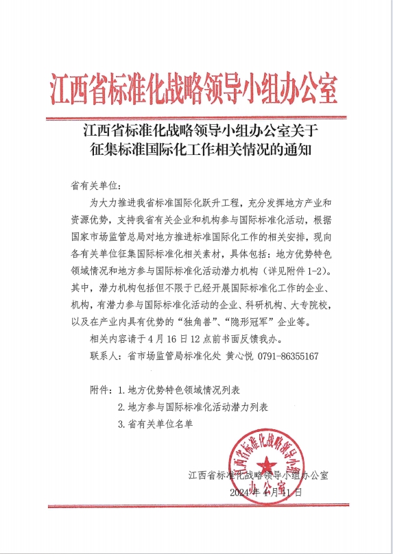 江西省标准化战略领导小组办公室关于征集标准国际化工作相关情况的通知